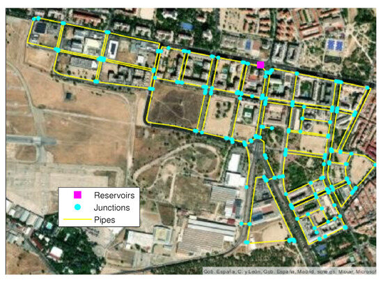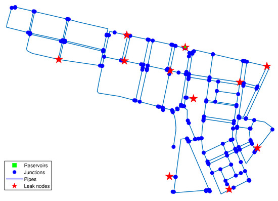 On the other hand, in [18], the authors proposed a model-based methodology on the basis of a sensitivity analysis using residuals. These residuals are used to estimate the leaky node. This methodology is applied when certain thresholds previously established using the historical demand in the network are exceeded. This methodology has been tested in real-life scenarios with acceptable results [19,20]; however, the dependence on a well-calibrated model of the WDN is highlighted. Following this direction, several strategies for control, supervision and diagnosis of pipes have been proposed to reduce the effects produced by network leaks [11]. These strategies include methodologies for modeling WDN using software, optimal sensor placement as well as data validation and reconstruction of sensors and several continuous monitoring techniques of the network for hydraulic and water quality analysis.