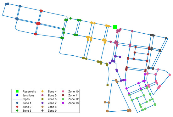 It should be noted that, in each case study, the proposed segmentation in zones causes a reduction in the size of the residual vector that would be generated by all possible scenarios of two simultaneous leaks in the network. For the Hanoi case study, there is a reduction from 46,500 leak scenarios to 6600, which, in turn, represents a reduction in the computational cost.