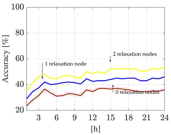 Similar as before, the relaxation node criteria shown in Figure 16 are used. On the one hand, the k-NN classifier had an accuracy rate less than during the 24 h period of analysis when neither relaxation node criteria are considered. For the one relaxation criterion, this classifier increased its accuracy rate from and it reaches up to at the end of the analysis. Finally, for the two relaxation node criterion, the accuracy rate begins with and reaches up to at 15 h and remains at this level up to the end of the analysis; see Figure 22.