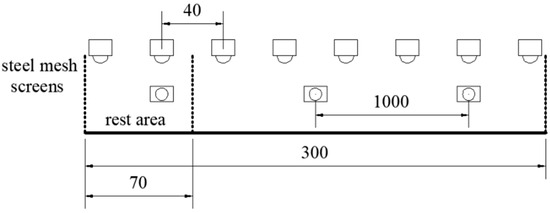 The section for observing the upstream migration of Grass Carp in this experiment was 11 m long, and fences were installed at the tailgate and water inlet of the flume. The experimental water was clean, which made it convenient to observe the swimming behavior of the fish. Fourteen high-speed cameras were installed 1.0 m above the experimental section to ensure that the video covered the entire section and recorded the entire swimming process of the fish during the experiment. The experimental arrangement is shown in Figure 8.