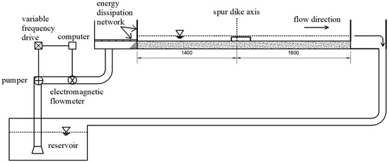 Experiments to observe the flow field and the upstream migration path of Grass Carp were conducted in a straight open-channel flume that was 30 m long, 3 m wide, and 0.8 m high with a bed slope of zero and concrete sidewalls and bottom. The water was piped into the flume from an underground reservoir. The inlet flow was controlled by an electromagnetic flowmeter, and an energy dissipation grid was arranged in front of the experimental tank to ensure the stability of the water flow. The water’s depth and drops in the water’s surface were controlled by the tailgate. A spur dike was installed in the middle of the flume, and the dike’s axis was 14 m away from the water inlet. A schematic of the flume system can be seen in Figure 3.