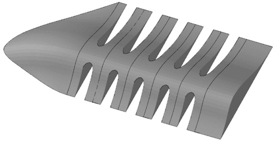 The independently designed permeable spur dike used the WES curve of an overflow weir as a reference for designing the spur dike’s body curve. The back slope curve of the spur dike consisted of a top curve section, a middle line section, and a return arc section. The upstream slope curve of the spur dike consisted of a top curve section and a return arc section. The top curve section was further optimized on the basis of the WES curve. The arc return section was an arc curve, and the middle line section was at a tangent to the top curve section and the lower arc return section. The dike body’s curve is shown in Figure 5. The spur dike was an assembled structure composed of a dike head, a permeable dike body, and a dike root. The permeability of the dike body was 17.6%, and the equation used to calculate the permeability is shown in Formula (1).