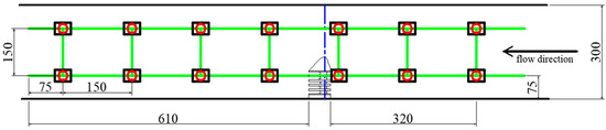 The XKVMS-02 large-area surface flow field observation system, produced by Chongqing Jiaotong University, was used to observe the impact of the spur dike on the local flow field of the river. This system collected images of plastic tracer particles moving on the water’s surface through high-definition cameras and calculated the distribution of fringes through software processing. The high-definition camera of the observation system had a shooting range of 3 m × 7 m, with two cameras arranged on the right bank of the flume, as shown in Figure 7.