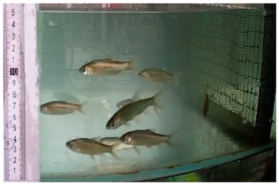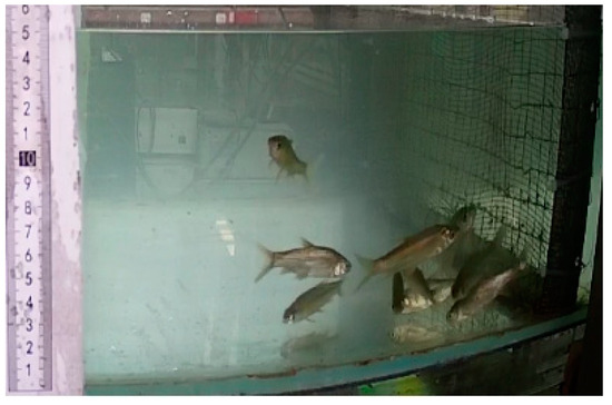 Fish sense the direction through the water flow when they are moving, thereby producing a flow response. The minimum flow velocity that can cause a fish to have a flow response is called the fish’s induced velocity. During the experiment, three groups of juvenile Grass Carp were used, with 10 in each group. These were placed in the resting area of the test section of the experimental tank. After acclimatization in still water for 1 h, the experimental flow velocity was gradually increased in increments of 0.5 BL/s, where BL was equal to the length of the experimental fish. At the same time, the swimming behavior of the fish was observed. When 90% of the experimental fish were observed to swim against the current, the flow velocity was taken as the induced velocity of the experimental fish. The movement status of the juvenile Grass Carp is shown in Figure 9 and Figure 10. The percentage of error of the experiment was 5%, and the standard deviation was 1.4%.