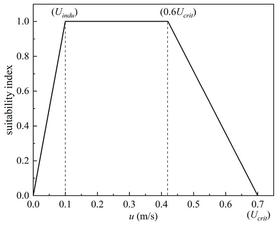 On the basis of the comprehensive experimental data and the movement of juvenile Grass Carp, it was found that the induced velocity of juvenile Grass Carp with a body length of 5 ± 0.5 cm was 0.10 m/s, the critical velocity was 0.70 m/s, and the preferred velocity range was between 0.10 m/s and 0.42 m/s. The suitability curve of flow velocity for juvenile Grass Carp is shown in Figure 13.
