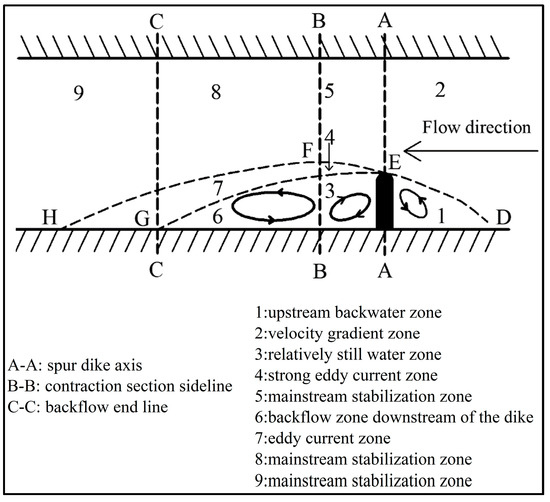 The distribution of the flow patterns near the spur dike was relatively complex. According to previous studies and combined with the observed experimental flow field, the flow field near the spur dike was divided into zones, as shown in Figure 14 [26], and the flow structure of each zone was analyzed.