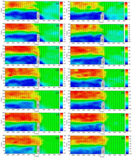Flow field distribution on the surface of spur dikes under different flows: (a) Q = 27.3 L/s; (b) Q = 59.5 L/s; (c) Q = 89.6 L/s; (d) Q = 119.1 L/s; (e) Q = 142 L/s; (f) Q = 156.4 L/s; (g) Q = 198 L/s; the left-hand graphs are for a rock-fill spur dike, and the right-hand graphs are for a permeable spur dike (unit: cm/s).