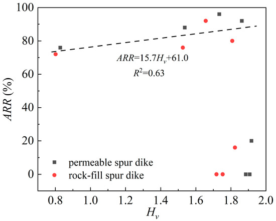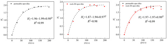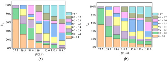 On the basis of the experimental results of the hydraulic characteristics of spur dikes in Section 3.2, the percentages of each velocity patch area in the total area of the traditional rock-fill spur dike and the experimental permeable spur dike under different discharge rates were calculated, and the law of the variation in the flow velocity diversity index Hv with flow discharge was analyzed. The percentage of each patch area at different flow discharge rates (Q) is shown in Figure 16.
