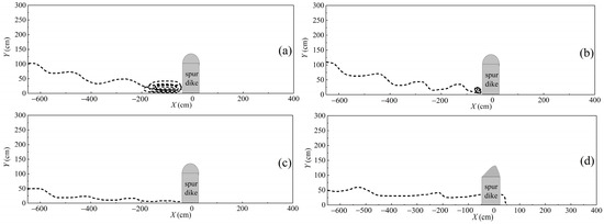 During the dry season (Q = 27.3 L/s), the flow velocity in the backflow zone was less than 0.1 m/s, which did not reach the induced velocity of the experimental fish. Some experimental fish in the backflow zone were unable to correctly find the upstream direction, and the experimental fish hovered in a large area of the water. In the flood season (Q > 142 L/s), the flow velocity downstream from the dike was large, and the experimental fish were unable to migrate upstream due to water stress and finally wandered and stayed within a small range. During the flood season (Q > 142 L/s), almost all of the experimental fish migrated upstream along the sidewall of the flume on one side of the spur dike to the zone of slow flow downstream from the spur dike, where the velocity was low, and they would become stranded there. When the spur dike was permeable, during the normal water season (Q = 119.1 L/s), some experimental fish would pass through the permeable holes and rest in the backwater zone upstream from the dike, ultimately becoming stranded upstream from the dike. The migration routes of stranding are shown in Figure 19.