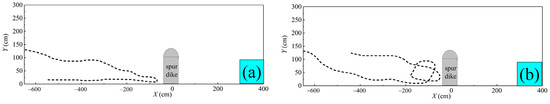During the dry season (Q = 27.3 L/s), the experimental fish in the backflow zone downstream from the spur dike were unable to accurately sense the direction of the incoming flow and swam freely downstream. When the experimental fish in the backflow zone downstream from the dike attempted to migrate upstream through the dike’s head during the normal water season (Q = 119.1 L/s), some of the weaker experimental fish retreated backward due to the high velocity and intensity of turbulence in the mainstream zone of the dike’s head. The migration routes of returning are shown in Figure 20.
