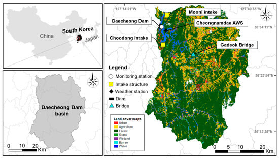 In this study, the Daecheong Reservoir was selected as the modeling target, which is located in the Geum River, one of the four major rivers in Korea. As shown in Figure 1, forest areas (78.3%) occupy most of the watershed land use attributes, followed by agriculture (13.8%), urban (3.4%), water (2.6%), grass (0.9%), barren (0.6%), and wetland (0.5%) areas. The total water storage capacity and surface area of the reservoir at normal water level (EL. 76.0 m) are 1490 million m3 and 72.8 km2, respectively. The reservoir is 86 km long, and the dam basin area is 3204 km2, accounting for 32.4% of the total basin area of the Geum River system. The average water depth is approximately 20 m, and at normal high water level (EL. 76.5 m), the maximum water depth extends to around 52 m. The Daecheong Dam, built in 1981, is a multi-purpose dam used for water supply, hydroelectric power generation, flood control, and environmental flow supply. The annual water supply of the Daecheong Dam is 1649 million m3, of which 79% is used for municipal and industrial purposes and the remaining 21% for irrigation purposes. The main flow control facilities of the dam include a power outlet (EL. 52.0 m) for downstream water supply and hydroelectric power generation, six gated spillways (EL. 64.5 m) for flood control, and two intake towers (EL. 57.0 m) supplying water to Daejeon and Cheongju city areas.