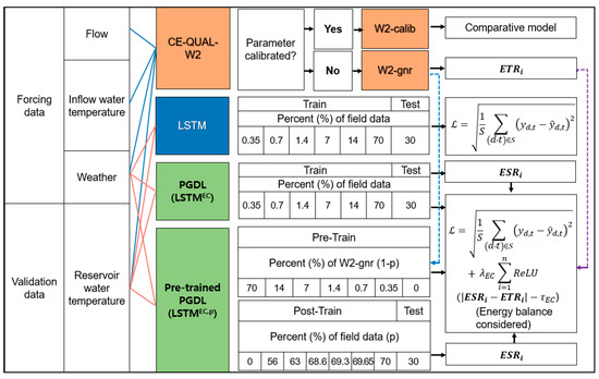 Schematic representation of data flow and model development processes. The shaded orange, blue, and green boxes represent process-based models (PBMs), data-driven models (DDMs), and process-guided deep learning (PGDL) models, respectively. The solid blue lines indicate the flow of data into the PBM, while the solid pink line represents the data input for the DDM and PGDL models. The blue dotted line represents the pre-training of the long short-term memory (LSTM) using uncalibrated CE-QUAL-W2 (W2-gnr) results, and the purple dotted line indicates the utilization of the temporally integrated energy (ETR) of W2-gnr as the error term in the cost function of PGDL and the pre-trained PGDL models.