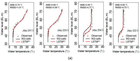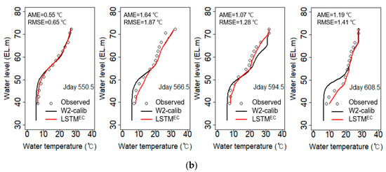 To evaluate the water temperature prediction accuracy of LSTMEC by water depth, the simulated water temperatures using the LSTMEC (red line) and W2-calib model (black line) were compared with the measured water temperatures (open circles) in Figure 4. LSTMEC appropriately simulated the change in water temperature profile by water depth over time in both the training and testing phases. LSTMEC showed high prediction accuracy with error values of AME = 0.14–1.64 °C and RMSE = 0.16–1.87 °C, which corresponds to better prediction performance than the W2-calib model (AME = 0.45–2.43 °C, RMSE = 0.51–2.91 °C). In particular, when examining the substantial errors observed in the water temperature predictions near the thermocline zone as simulated by the W2 model, the LSTMEC model exhibited markedly improved outcomes.