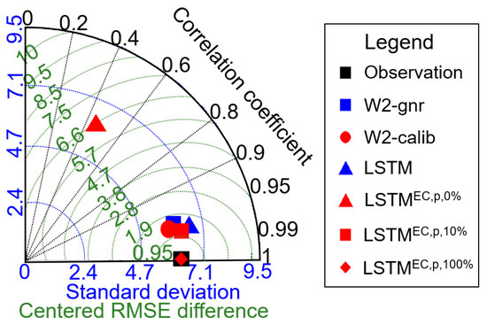 Comparison of the water temperature simulation performance of each model using a Taylor diagram. W2-gnr: uncalibrated CE-QUAL-W2 model; W2-calib: calibrated CE-QUAL-W2 model; LSTM: long short-term memory model trained with field data without considering energy conservation; LSTMEC: LSTM model trained with field data considering energy conservation; LSTMEC,p: pre-trained LSTMEC model with W2-gnr results and later fine-tuned using field data.