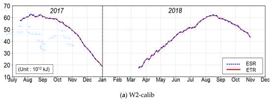 where is a threshold value for loss of energy conservation, which was introduced to consider factors ignored in calculating the amount of heat exchange through boundary conditions and observation errors in meteorological data. For , the maximum value of the absolute difference between daily averaged spatially integrated energy (ESR) and (ETR) ( calculated in W2 that satisfies the energy balance was used [24,56].
