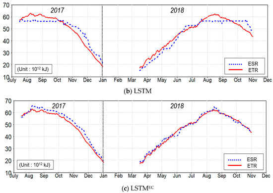 One of the strengths of the LSTMEC model is that it can secure physical law consistency, which is a weakness of the LSTM model. To evaluate the satisfaction of the energy conservation law in LSTMEC, the time series changes of ETR and ESR during the simulation period were compared along with the results of W2-calib and LSTM, as shown in Figure 6. The coincidence of ETR and ESR means that the conservation law of thermal energy changes along the reservoir boundary and inside the reservoir water body is satisfied. During the simulation period, the W2-calib model based on physical laws matched the changes in ETR and ESR very well (Figure 6a). The W2-calib model predicted reservoir water temperature by considering air-water heat exchange and heat flux at inflow and outflow interfaces. At each calculation time, the model checked the heat balance and thus satisfied the energy conservation law. However, in the case of LSTM, which is a DDM lacking physical laws, the discrepancy between ETR and ESR was confirmed in most periods, and the difference increased more in winter (Figure 6b). On the other hand, LSTMEC with the energy conservation term added to the objective function showed lower energy agreement than the W2-calib model but better energy agreement than the LSTM model (Figure 6c). From these results, it can be confirmed that the PGDL algorithm contributes to improving the limitations of deep learning models.