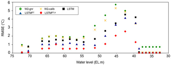 Comparison of RMSE by reservoir water level for W2-gnr, W2-calib, LSTM, LSTMEC, and LSTMEC,p, W2-gnr: uncalibrated CE-QUAL-W2 model; W2-calib: calibrated CE-QUAL-W2 model; LSTM: long short-term memory (LSTM) model trained with field data without considering energy conservation; LSTMEC: LSTM model trained with field data considering energy conservation; and LSTMEC,p: pre-trained LSTMEC model with W2-gnr results and later fine-tuned using the field data; RMSE: root mean square error; EL.m: height above mean sea level in meters.