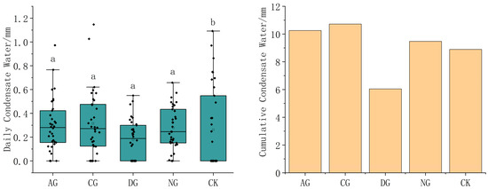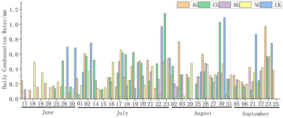 - From June to September 2022, the total amount of surface condensation water under S. psammophila was 45.40 mm, and the total precipitation for the same period was 224.96 mm, with the total condensation water accounting for 20.18% of the rainfall for the same period. During the test period, the highest amount of condensation water was recorded in September (0.38 mm), whereas the lowest was recorded in June (0.26 mm).