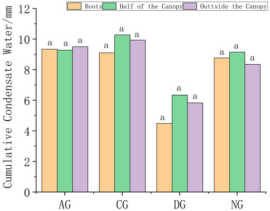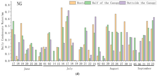 - The presence of S. psammophila considerably reduced the amount of surface condensation water, with the average daily condensation water in the different irrigation groups (AG, CG, DG, and NG) being 49%, 35%, 51%, and 50% lower than that of the bare ground control group, respectively. The amount of surface condensation water tended to increase from the roots of S. psammophila to half of the canopy to the outside of the canopy, from the inside to the outside. S. psammophila blocked solar radiation and reduced the Ws, which decreased the near-surface temperature, intercepted some water vapor from reaching the ground, and decreased the intensity of soil condensation and evaporation.