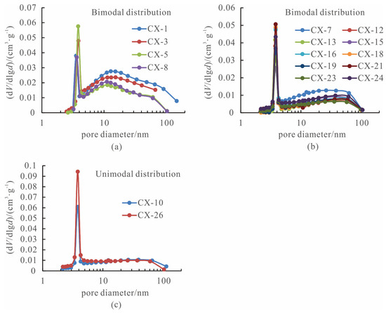 - The mineral composition of shales in the study area primarily consists of clay minerals, quartz, feldspar, and carbonate minerals, which is similar to the shale mineral composition found in American Ohio shale. The pore structure is characterized by open parallel plate slit pores and inclined slit pores, which is favorable for the migration of shale gas. The pore size distribution curve exhibits unimodal and bimodal distributions, with the bimodal distribution further divided into two types. Micropores and mesopores with pore sizes lower than 50 nm contribute to the majority of the specific surface area, and mesopores account for the highest proportion of pore volume.