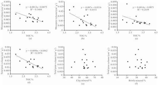 - The micropore, mesopore, macropore, and total pore volumes of lacustrine shale in the study area show a negative correlation with TOC content, indicating that the organic matter of shale is likely still in the first pyrolysis stage. No significant correlation is observed between pore volume and clay mineral content or between pore volume and brittle mineral content due to the complex interplay of several geological factors.