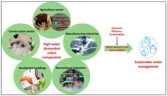 This study focuses on the assessment of water valuation and the optimization of water utilization in urban areas. In this study, high water-demanding components of urban components as agricultural industries, manufacturing industries, construction industries, residential buildings, and recreational industries have been identified and taken into consideration. Figure 1 shows the graphical illustration. The present investigation analyzes the scholarly articles and examines the methods of valuation and effective optimization of water consumption in the primary urban applications. The articles were published between 2000 and 2022 and were selected according to the preferred reporting items for systematic analysis and meta-analyses (PRISMA) guidelines. The present study was carried out by employing the Web of Science, Scopus, Springer, and Science Direct databases. The search was conducted using specific keywords, including water valuation, reforming water pricing, improving water efficiency, and urban water usage.