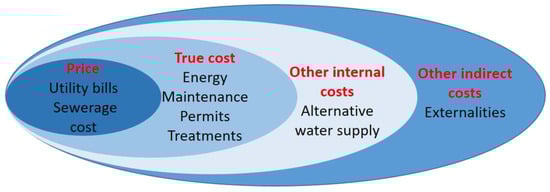 In the manufacturing industry, water cost and price are often regarded as interchangeable terms, referring to the expenses incurred by the company for the consumption of this resource. This is akin to the cost of procuring or utilizing any other product or resource in the production process. The expenses and pricing of manufacturing processes are subject to fluctuations based on the source of water, whether from an in-house water supply or an external purchase. Figure 4 depicts the various categories of costs that are considered in water management. However, it is important to note that these costs do not encompass all expenses associated with water utilization. Apart from the initial cost, the comprehensive cost encompasses additional expenses incurred by the user including energy consumption, maintenance, permits, and treatments [32]. Additional expenses incurred internally pertain to ensuring an adequate water supply to fulfil production requirements.