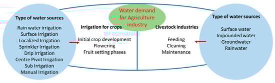 The augmentation of food production is a crucial factor because of the high concentration of the human population. Crop cultivation and livestock husbandry are the two categories of agricultural industries, and their water requirements are depicted in Figure 5 along with their water sources. The agriculture sector generates more than 75 percent of the world’s water demand, and water scarcity issues are more severe in this sector than in others. The majority of suburban and rural agricultural industries rely on natural water sources such as surface water, groundwater, and rainwater, with the availability of water and scarcity having little impact on water needs. In contrast, urban areas rely primarily on artificially treated water, with scarcity having a significant effect.