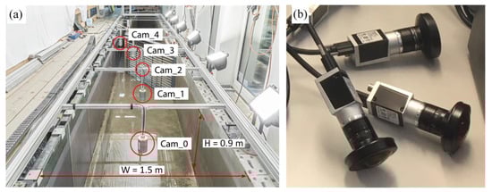(a) Etho-hydraulic flume of VAW with five top-view fisheye cameras and halogen lamps directed at a white sheet above to provide uniform lightning. The left side of the flume is an observation window, while the wet line on the right side shows the usual water depth; (b) three Basler cameras equipped with fisheye lenses and connected via GigE cables, yet not housed in the waterproof enclosures [19].