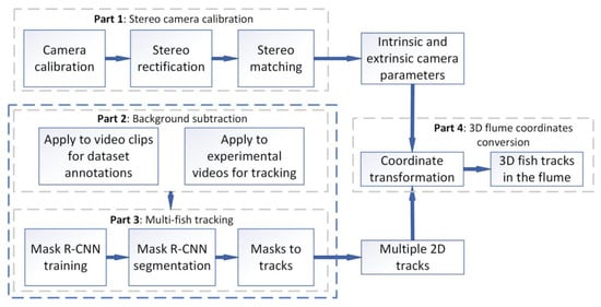 Workflow of FishSeg, which includes four parts: (1) Stereo camera calibration, (2) Background subtraction, (3) Multi-fish tracking, and (4) 3D flume coordinates conversion.