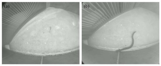 Two main problems that affected the tracking quality of Detert’s code were the detection of low-color-contrast fish and the interference of fish shadows [19]. To present an impression of our video quality, two frames collected from the experimental videos for trout and eel tests are displayed in Figure 3. For such videos, Ref. [19] computed the median background from 100 frames equally selected from the entire video sequence and converted each filtered image into a binary image. By comparison between the tracked image and the background image at an absolute difference of <8-pixel intensities, the moving objects could be separated from the background image. However, the subtraction results were not satisfying due to two reasons [19]. Firstly, the body color and size of fish could change when fish swam around at different vertical depths. Secondly, the illumination conditions changed rapidly with surges of air bubbles or light reflections. Thus, the traditional background subtraction method with a fixed threshold for pixel intensities could not meet the requirements under such complicated experimental conditions.