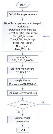 Process of finding the optimal hyper-parameter with learning curves for losses as performance indicators. Parameters that have been tested for learning rate, learning momentum, and weight decay are included in the flow chart, with the number marked with an asterisk applied for the final model.