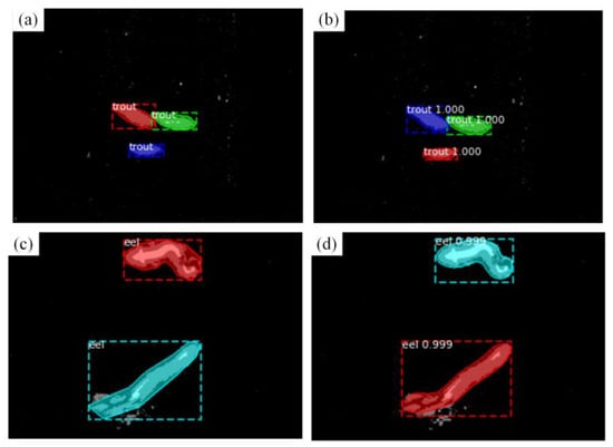 Annotated image samples and visualization of the validation datasets of (a,b) brown trout and (c,d) European eel. Note that (a,c) are the images annotated from pre-processed video clips, while (b,d) are the images with mask predictions of trout and eel models, respectively. The number marked beside the rectangular box was the prediction score, with score of 1 denoting a perfect prediction.