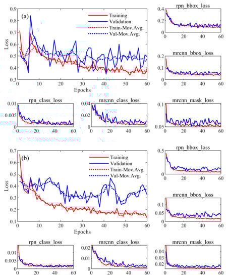 where L is the total loss of the network, Lrpn-class is the loss assigned to improper classification of anchor boxes by RPN, Lrpn-bbox corresponds to the localization accuracy of the RPN, Lmrcnn-class is the loss assigned to improper classification of objects present in the region proposal, Lmrcnn-bbox is the loss assigned on the localization of the bounding box of the identified class, and Lmrcnn-mask denotes masks created on the identified objects. Note that the learning curves of each loss can be used to diagnose the model performance.