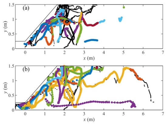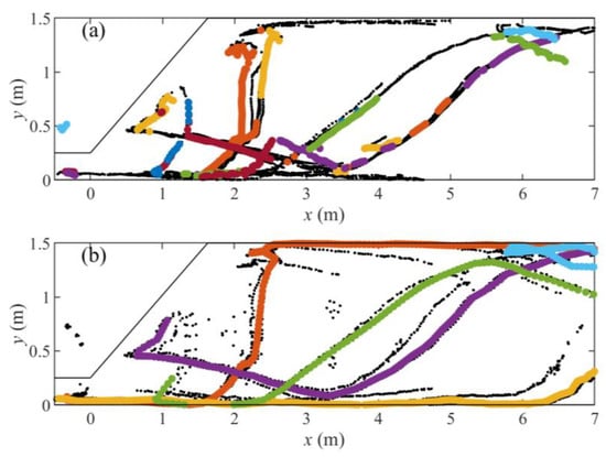 Top view of 3D fish tracks of trout obtained using (a) Detert’s code [19] and (b) FishSeg. Black dots are fish tracks separately obtained using five cameras, and colored dots are the final fish tracks after merging overlapping tracks. Each color indicates the track of one fish that is continuously recognized.
