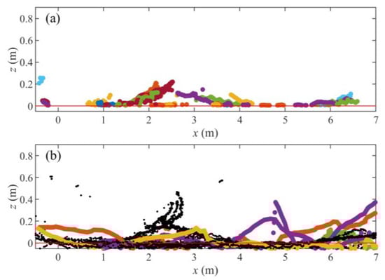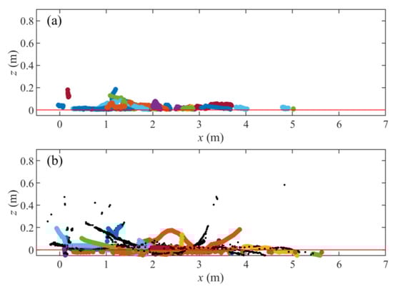 The top view of trout tracks is presented in Figure 8, with black dots separately tracked from five cameras and colored dots indicating the merged fish tracks. As displayed in Figure 8, trout tended to swim interactively, especially near the fish guidance rack and bypass, which could lead to misidentification of fish IDs with overlapping or occlusions. A comparison of Figure 8a,b shows that trout tracks obtained from FishSeg were more connected and continuous compared to those obtained with Detert’s code [19]. Specifically, in Figure 8a, tracks from x = 4 m to x = 6.5 m are highly discontinuous, indicating that fish were not tracked at all or filtered out in this range. This could result from the low color contrast between fish and flume bottom or the relatively small body size of fish. In addition, when three trout swam close to each other near the rack, occlusions could happen with overlapping mask predictions. Thus, their tracks were identified as separate individuals, leading to excessive unconnected tracks. However, some of the lost track points between x = 4 m and x = 6.5 m in Figure 8a were found successfully by FishSeg, and the tracks were more continuous near the rack area where strong fish interactions were observed (Figure 8b). Side-views of trout tracks are also presented in Figure 9 as a supplementary illustration of 3D fish tracks. In Figure 9a, almost all trout tracks were vertically distributed within the range of z = 0~0.1 m, while in Figure 9b, FishSeg could successfully track trout that swam up to z = 0.2 m. This again proved the advancement of FishSeg tracking for trout swimming close to the flume bottom.