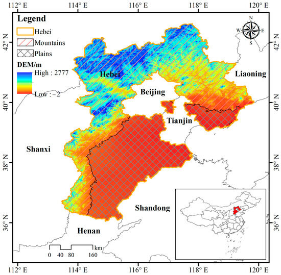 Hebei Province was chosen as the study area, which is distributed in the North China Plain. It is between 113°27′–119°50′ E longitude and 36°05′–42°40′ N latitude, covering an area of approximately 1.88 × 105 km2, as shown in Figure 1. It has higher terrain in the northwest and lower terrain in the southeast, including plateaus, mountains, hills, and plains. Precipitation is concentrated in summer, with the multi-year mean annual precipitation of 503.49 mm [22]. Based on the Hebei Water Resources Bulletin, the water resources of the province have been deficient for many years, of which groundwater storage loss is the most serious. According to data statistics from 2010 to 2017, the average annual total water resources in Hebei Province is 161.79 × 108 m3, while the average water consumption is 190.05 × 108 m3, indicating a shortage in the overall water supply. The average per capita water resource is 220.12 m3, which is only 10.51% of the national per capita level [20]. The plains have seen several groundwater funnels, including two shallow groundwater funnels and two deep groundwater funnels, such as Jizaoheng and Nangong (http://slt.hebei.gov.cn, accessed on 15 January 2020). The south-to-north water-diversion project was implemented in 2002 for relieving the shortage of water resources in North China, including three routes (east, central, and west), of which the central route officially diverted water to North China (including Beijing, Tianjin, Hebei, and Henan) in December 2014, with 9.21 billion km3 of water transported from Danjiangkou Reservoir to northern China each year.