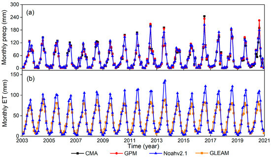 Comparisons of different kinds of (a) precipitation and (b) ET products over Hebei Province from 2003–2020.