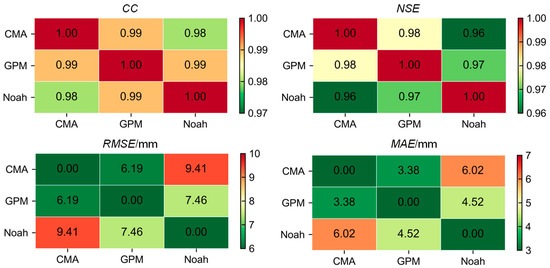 The time series of three precipitation and two ET products are shown in Figure 3, spanning from January 2003 to December 2020 over Hebei Province. Figure 3a shows that the seasonal characteristics and variation ranges of precipitation data are basically consistent, with the CC and NSE above 0.96 (Figure 4), and 74% of precipitation is concentrated from June to September of each year. The differences between GPM and CMA precipitation data are the smallest, and the RMSE and MAE metrics are 6.19 mm and 3.18 mm, respectively. The differences between Noahv2.1 and CMA precipitation data are the largest, with the RMSE and MAE values of 9.41 mm and 6.02 mm (Figure 4). With respect to the ET products, it can be observed from Figure 3b that the seasonal characteristics of the two ET data show good consistency, with CC and NSE of 0.96 and 0.71, respectively. In addition, the variation range of the Noahv2.1 ET product is significantly larger than that of the GLEAM result. The maximum differences mainly occur in summer. Specifically, the RMSE and MAE between the two ET products are 14.06 mm and 10.70 mm, respectively.