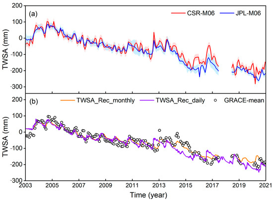 Comparison of different TWSA solutions: (a) time series of GRACE-derived TWSA during 2003–2020; (b) time series of reconstructed daily and monthly TWSA estimates over Hebei Province.