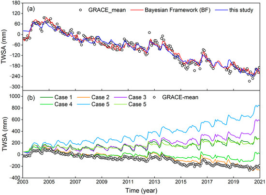 The temperature and precipitation products are provided by CN05.1 so as to reconstruct the climate-driven TWSA estimates. The temporal and spatial resolution are daily and 0.25°, respectively. The CN05.1 products are developed based on the “anomaly approach” in the process of interpolation [31]. Previous studies [32] have demonstrated that the input variables based on CN05.1 can generate more accurate TWSA solutions than other remote sensing products and were thus used in this study. Up to now, many innovative methods have been developed to reconstruct long-term TWSA solutions, including long-term precipitation driven [33], Bayesian convolutional neural network [34], and Bayesian framework (BF for short) [35]. The BF-based TWSA solutions have been proven to display the best performance in the Haihe River Basin relative to other available reconstructed results; thus, this product was utilized to assess the accuracy of the reconstructed results computed by this research.