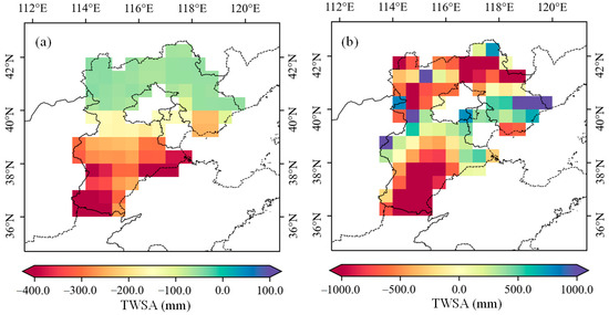 Spatial distribution of TWSA in Hebei Province in December 2020: (a) GRACE-based TWSA solutions; (b) WB-based TWSA estimates.