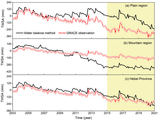 Lastly, based on these above results, the accuracy of WB-based TWSA was validated based on GRACE-derived results from the viewpoint of temporal and spatial scales. The characteristics of TWSA were analyzed by using GRACE- and WB-based results. More importantly, this study further evaluates the influence of the SNWD project on the water storage over mountain regions, plain regions, and Hebei Province to provide suggestions and data support for the management of water resources.