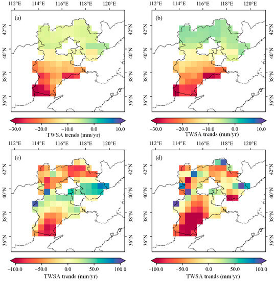 Spatial distribution of TWSA trends in Hebei Province: (a) GRACE solutions from 2003 to 2014, (b) GRACE solutions from 2015 to 2020, (c) WB-based estimates from 2003 to 2014, and (d) WB-based estimates from 2015 to 2020.