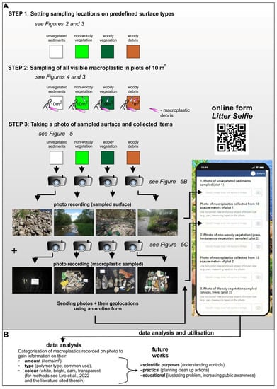 In this paper, we aim to overcome this challenge by presenting a guide that involves the engagement of non-expert users only for the sampling and photorecording of macroplastics deposited in the plot (10 m2) located within four strictly defined emergent surface types that commonly occur in mountain river valleys. To minimise the bias resulting from non-specialist users counting and categorising macroplastic debris, our guide assumes the involvement of non-specialists only for the sampling and recording of collected items by taking geolocated photos using an online form available at https://arcg.is/Sffyn (accessed on 9 August 2023). The future identification of the number (items/m2) and types (e.g., polymer composition) of macroplastic items collected is conducted by experts (e.g., environmental scientists with experience in riverine plastic pollution research) using these geolocated photos. The proposed method can allow for the large-scale collection of data on the macroplastic deposition levels along mountain rivers and their utilisation for scientific and clean-up purposes. The collected photos illustrating the amount of macroplastics deposited in the given locations of rivers can also be used as illustrative materials to increase the awareness of local communities about the plastic pollution problem.