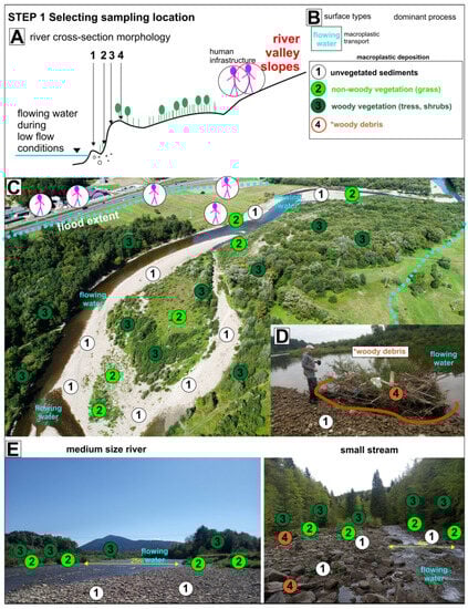 The first step involves the selection of the locations for the sampling plots. These locations should be selected in the emergent area located close to the flowing water. The selected plots should not be located in close proximity to the plastic emission sources (e.g., dumping sites, transport, buildings, and tourist infrastructures) (Figure 2A). Setting the sampling plots near the flowing water is important because this allows for the recording of macroplastic abundances, which result from its upstream transport by the river and from the local conditions controlling its trapping efficiency (e.g., river hydrodynamics and type of vegetation). The avoidance of local sources of plastic emissions in this zone limits the potential for bias resulting from increased abundances of macroplastics close to them. Mountain rivers can have very diverse channel morphology and related vegetation patterns (Figure 2), and previous studies have found that this diversity substantially controls the amount of macroplastics deposited in a river []. Specifically, highly rough surfaces (e.g., woody debris and woody vegetation) trap significantly more macroplastics than other surfaces with a lower surface roughness (e.g., bare sediments and non-woody vegetation) []. To record the range of macroplastic abundances among these surface types, we recommend collecting macroplastics from plots located in the following surface types in each sampling location selected along the river (Figure 1, Figure 2C and Figure 3):