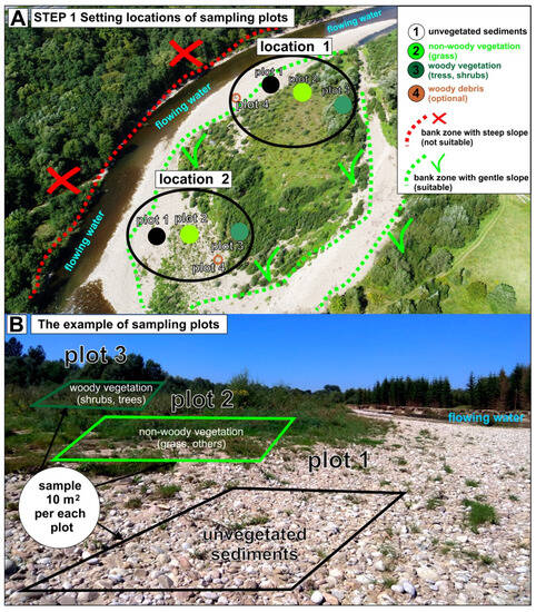 We suggest starting the entire procedure of locating sampling plots by selecting a riverbank zone with a gentle slope (see Figure 3A). This allows for a safe survey performance and provides a greater potential for us to locate sampling plots within a well-developed variety of surface types in each location. Steep and high channel banks, commonly occurring along the channelised rivers, should be avoided because these do not allow for safe surveys and typically present much worse developed land covers and morphological gradients (see Figure 3A). Then, to select locations of sampling plots with different surface covers, we recommend walking across the selected, gentle riverbank up to the flowing water. This can be the main river channel or one of the side channels in the case of multi-thread rivers. When the flowing water is reached, we recommend seeking a place where unvegetated sediments occur and where it is surrounded by vegetation (non-woody or woody). The first plot should be located on the unvegetated sediment surfaces in close proximity to the nearest vegetation site (non-woody or woody). The second plot should be located in close proximity to the first one, on a surface covered by non-woody vegetation (grass or herbaceous vegetation). In the same way, the third plot should be located close to plot 2. Woody debris can occur on all of the mentioned surface types (see []). The location of the woody debris plot should be set as close as possible to the other sampled plots (10 m2). The size of the woody debris plots that need to be sampled is not as strictly defined in our guide as it is for the other types of sampled surfaces (for details, see Section 2.2 and Figure 4). The locations of the sampling plots being as close as possible to each other allows us to obtain data on the range of macroplastic deposition occurring on the different surface types in one location along the river. If unvegetated sediments do not occur in a given location, the sampling should start from the second plot (non-woody vegetation). Similarly, if other surface types (woody vegetation and woody debris) do not occur in a given location, the sampling should cover only the existing surface types (Figure 3B). In this case, only two surface covers are sampled in that location.