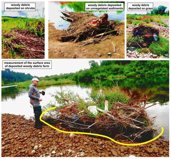 The first step towards evaluating and mitigating the risks resulting from macroplastic deposition along mountain rivers involves the collection of uniform information on its abundance levels within diverse emergent surface types occurring in mountain river valleys (e.g., unvegetated sediments, non-woody vegetation, woody vegetation, and woody debris) []. These diverse surface types produce different potentials for macroplastic deposition, resulting from their different positions in the mountain river corridor and diverse surface roughness values [,]. Previous studies have documented that the amount of macroplastics deposited in a mountain river channel highly differs among locations with different channel morphologies, vegetation covers, and abundances of woody debris forms []. Thus, the type of land cover occurring in a river channel zone, where macroplastics are transported by flowing water, can be seen as a factor that importantly modulates the trajectories of their deposition in the fluvial system, which can last from days to centuries [,]. Moreover, the characteristics of the place where a macroplastic is deposited (e.g., exposure to sunlight or water) can also determine the potential for its fragmentation via biochemical and physical forces, influencing the emission of secondary microplastics []. Thus, collecting information on the amount and type of macroplastics deposited in specific zones along the mountain river can ultimately help us to not only assess the amount of plastic stored in a given river unit (see []), but also to (i) estimate how much of them can be further remobilised or fragmented, creating future risks for biota and humans life not only in the mountains, but also downstream [], and (ii) to locate the river valley sections where future clean-up actions are the most necessary and can be the most effective.