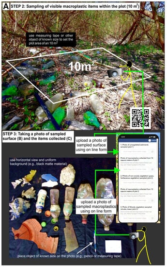 The photos of the sampled surfaces and the macroplastic items collected from them should be uploaded using an online form available at https://arcg.is/Sffyn (accessed on 9 August 2023) (see Figure 5B,C). The information about the geolocation of the sampled plots is captured automatically when a GPS signal is available in the sampling location. For a location without a GPS signal, it can be also added manually on the map that is available in the online form.