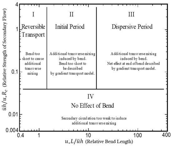 The criteria expressed by Almquist and Holley [] are summarized in Figure 2. The depiction presents four distinct regions characterizing various transverse mixing patterns as follows: (1) Bend of insufficient length to induce supplementary mixing, irrespective of secondary circulation intensity (reversible transport); (2) additional mixing driven by secondary circulation, distinct from gradient transport (initial phase); (3) additional mixing characterized by gradient transport due to secondary circulation (dispersive phase). (4) Secondary circulation of insufficient strength to bring about supplementary mixing (bend has no effect). The classification schema depicted in this figure is founded on fundamental mechanisms that have been comprehensively understood to an extent permitting quantification and correlation with relevant dimensionless parameters.